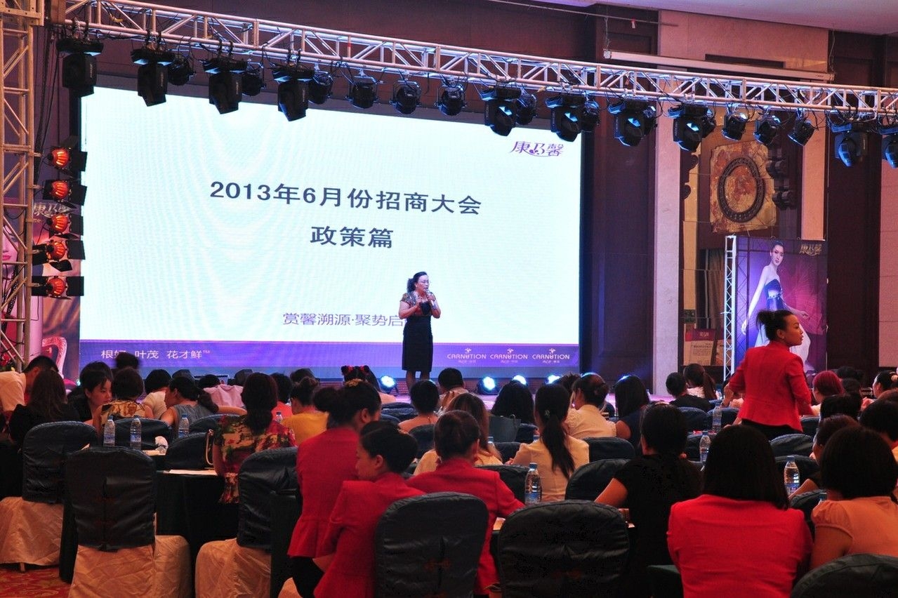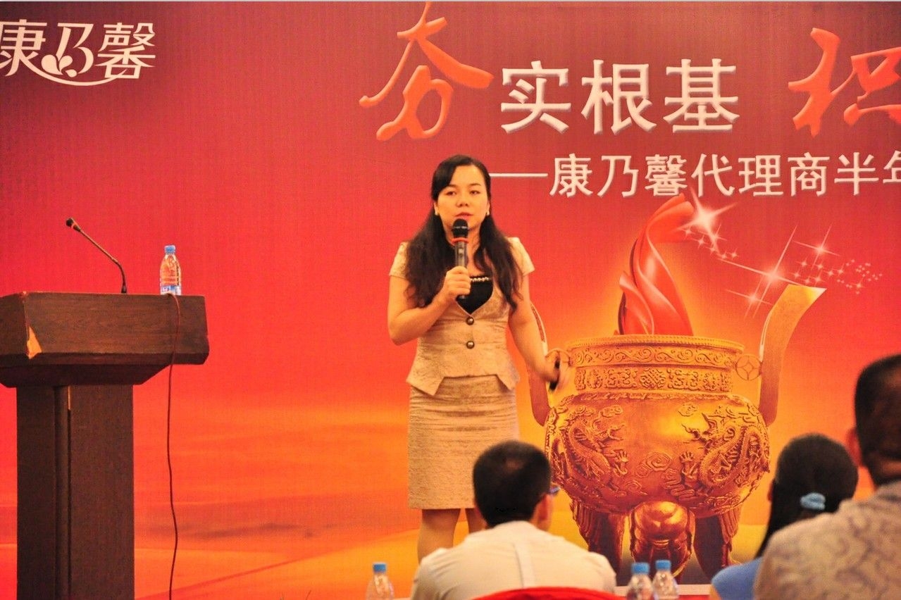 康乃馨公司销售总监廖焕丽女士介绍了本次大会及即将召开的八月全国大会政策,现场气氛再次达到高潮,代理商们纷纷表示支持。