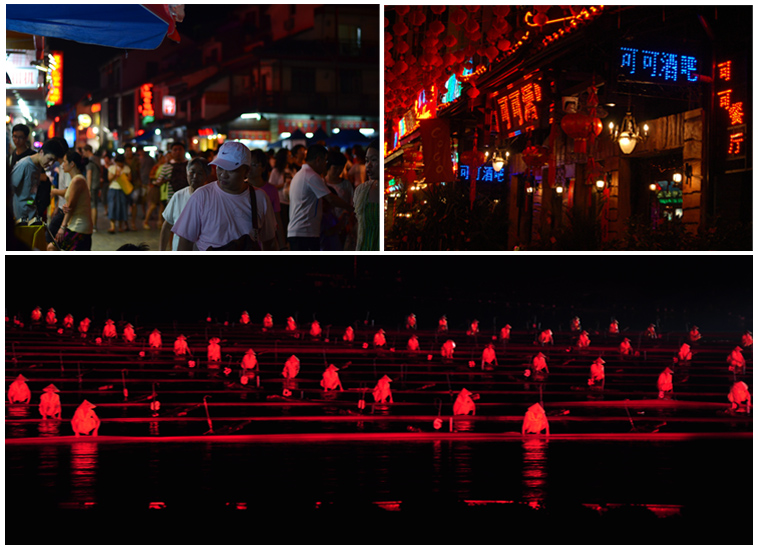 华灯初上,喧闹的小县城灯火通明,人潮川流不息,我们欢聚在当地最有特色的啤酒鱼店,美味当前,疲劳尽扫一空,同事们觥筹交错、推杯换盏之间,凝聚成一瞬永恒,欢快近收。除了美味,公司精心安排观赏的大型山水实景演出——印象刘三姐,全新概念实景的演出;集合艺术性、震撼性、民族性、视觉性、由600多演员组成;壮族、瑶族、苗族等不同的少数民族服装不同演义,大家叹为观止。配合实景山水及灯光,还原于自然,成功诠释了人与自然的和谐关系,我们陶醉在空前壮观的舞台灯光艺术圣堂……观赏完后,我们意犹未尽的行走在历经1400多年,阳朔最古老最繁华的街道——西街,灯红酒绿、人潮涌动的商业街交错着暖意十足的酒吧,放松、休闲、惬意……