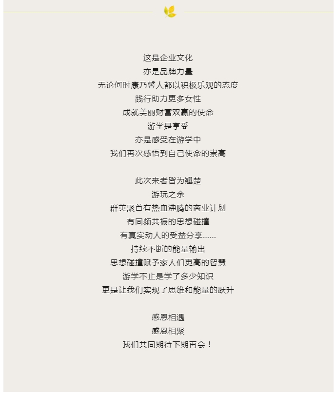 智能新康养•产康新未来 | 2023馨悦佳人VIP康养之旅圆满收官! 发布时间:2023-09-13 上一篇:强势收官|第21届CBME孕婴童展今日完美闭幕! 下一篇:聚势增长 共享未来丨2023康乃馨代理商年终答谢会星耀清远,赋能未来! 热文推荐 1、产后气血亏虚会有哪些表现?气血... 2、三伏已至,一同探索康乃馨「草帽... 3、精进赋能 聚力共赢|2024康... 4、为爱发光丨呵护女性生殖健康 ,... 5、砥砺奋进 勇毅前行|2024康... 最新专题 1、康乃馨团队赴井冈山学习,让健康... 2、康乃馨幸龄“壹肆玖工程”正式启... 3、领势前行,粤见馨篇 ▏康乃馨2... 4、康乃馨粉蓝丝带 ▏关于爱与健康... 5、馨悦佳人 粉蓝丝带 ▏私密健康... 相关文章: