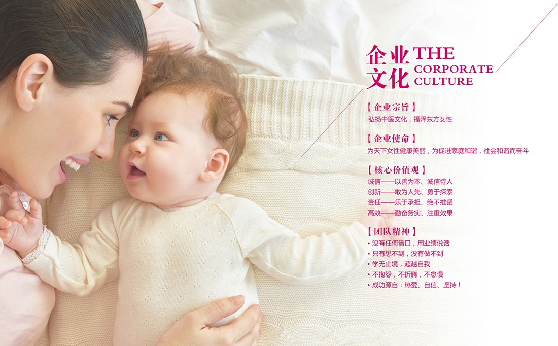 “弘扬中医文化,福泽东方女性”是我们的企业宗旨。积极响应国家关于发展中医预防美容服务的伟大号召,大力弘扬传统中医养生文化,全面呵护现代母婴健康。