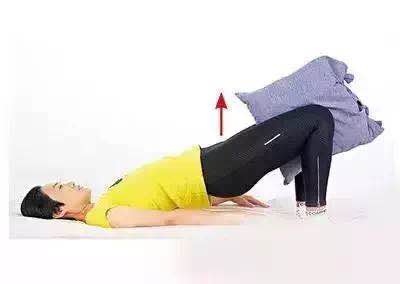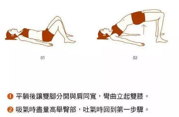 Step2:将臀部缓缓抬起,让身体与大腿呈一直线,停留3~5秒后缓缓将臀部放下,重复8~12次。