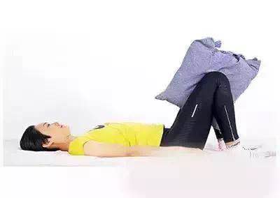 Step1:平躺后将双手自然垂放两旁,膝盖弯曲、脚跟靠近臀部,双膝间夹著抱枕。